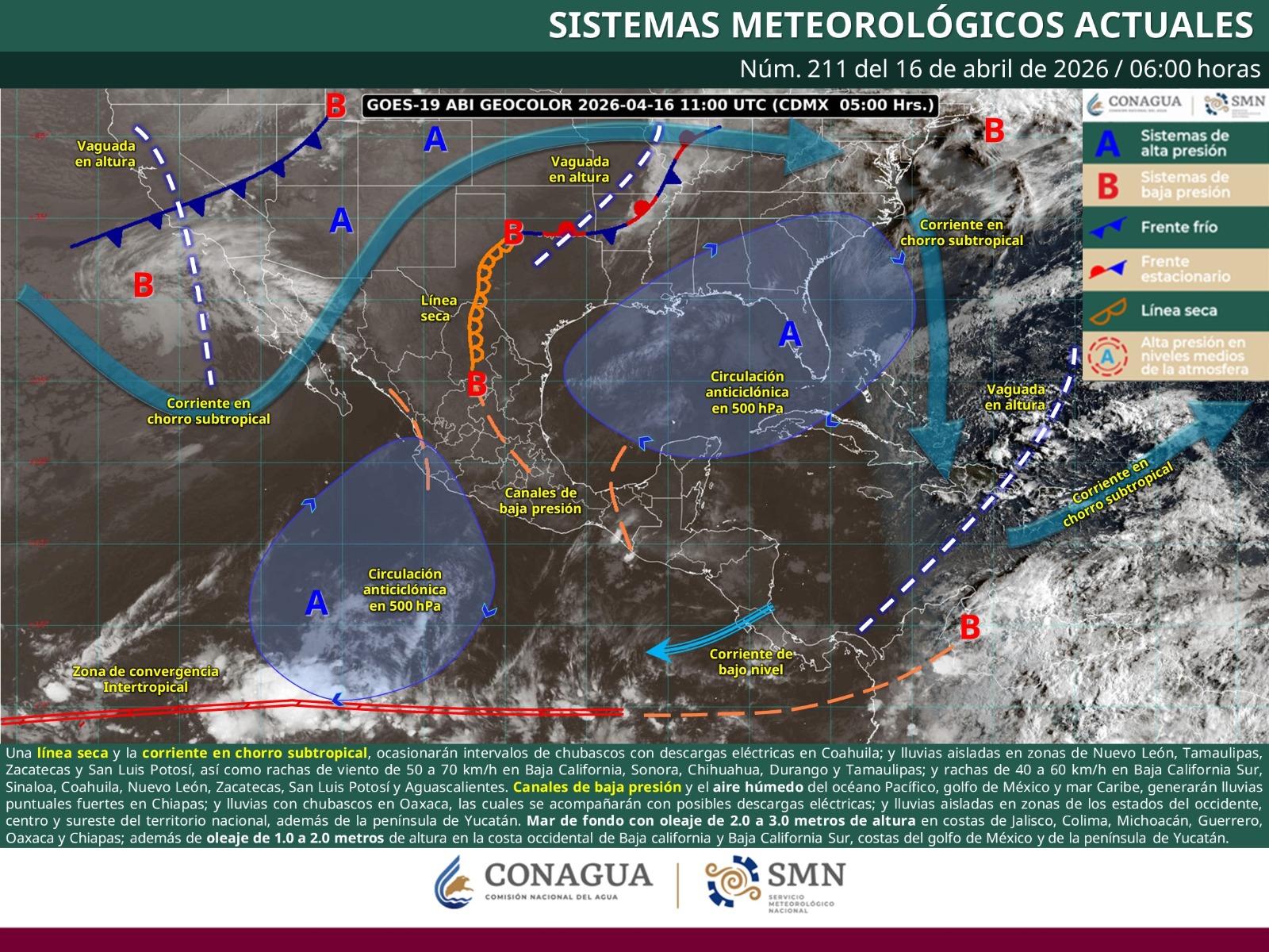 Finalmente, el Servicio Meteorológico Nacional (SMN) informó que, durante este jueves 16 de abril se mantendrá la onda de calor en zonas de Sinaloa (centro y sur), Nayarit (norte y sur), Jalisco (oeste y sur), Colima (este), Michoacán (centro y oeste), Morelos (sur), Puebla (suroeste), Guerrero (noroeste, este y sur) y Oaxaca (sur). Se pronostica mar de fondo con oleaje de 2.0 a 3.0 metros de altura en costas de Jalisco, Colima, Michoacán, Guerrero, Oaxaca y Chiapas; además de oleaje de 1.0 a 2.0 metros de altura en la costa occidental de Baja california y Baja California Sur, y en costas de Tamaulipas, Veracruz, Tabasco, Campeche, Yucatán y Quintana Roo.