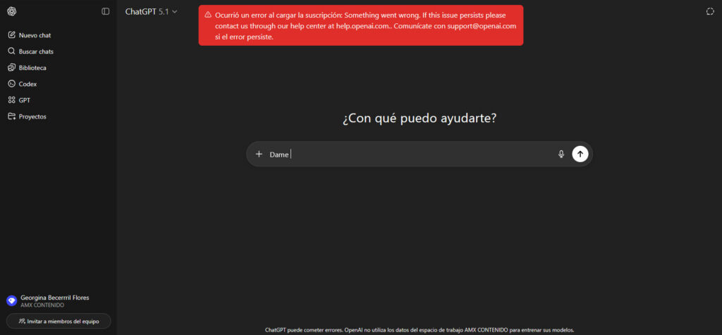 “Ocurrió un error al cargar la suscripción. Algo salió mal. Si el problema persiste, por favor contáctenos a través de nuestro centro de ayuda help.openai.com”.