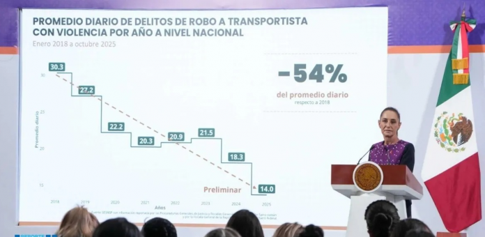 La Estrategia Nacional de Seguridad en Carreteras, impulsada por el gobierno de la presidenta Claudia Sheinbaum Pardo, logró una reducción del 54% en el promedio diario de robos con violencia a transportistas en los últimos siete años.