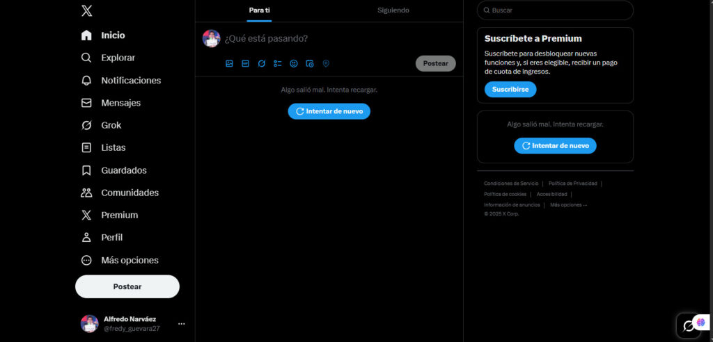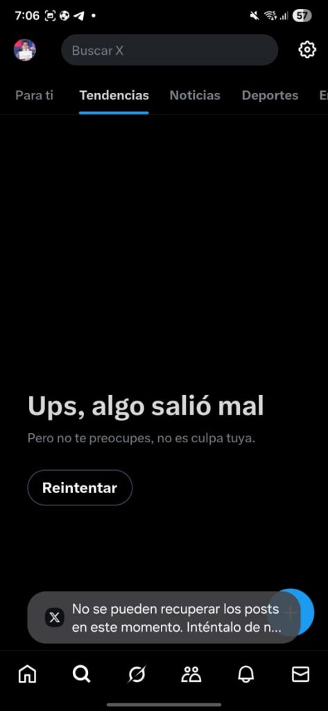 Un reportero de Unotv.com pudo comprobar durante las primeras horas de este martes que, tanto en la versión web como en la app móvil de X (Twitter), no cargaban los posts y aparecía el mensaje “Algo salió mal“.