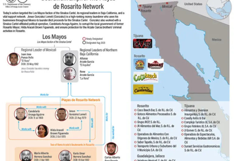La medida afecta directamente a cinco personas y 15 empresas vinculadas a las operaciones de Los Mayos en Rosarito, Baja California, un corredor clave de tráfico hacia Estados Unidos.