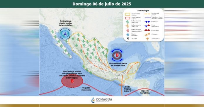 «Canales de baja presión sobre la Mesa del Norte, la Mesa Central, el noreste, oriente y sureste del territorio nacional, en interacción con una circulación ciclónica en altura, divergencia e ingreso de humedad de ambos océanos», informó el SMN.