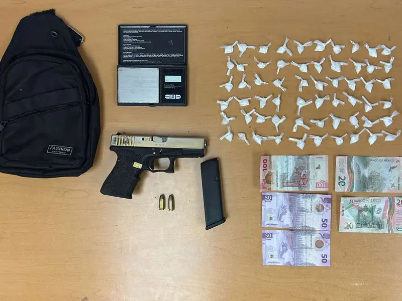 Posteriormente en las escalinatas de Lago de Pátzcuaro y Campeche observaron a dos varones consumiendo bebidas embriagantes. Uno huyó y el detenido fue identificado como Jesús “N”, de 21 años de edad que traía un arma de fuego abastecida con dos balas, 60 dosis de una sustancia sólida parecida al cristal, dinero en efectivo y una báscula digital.