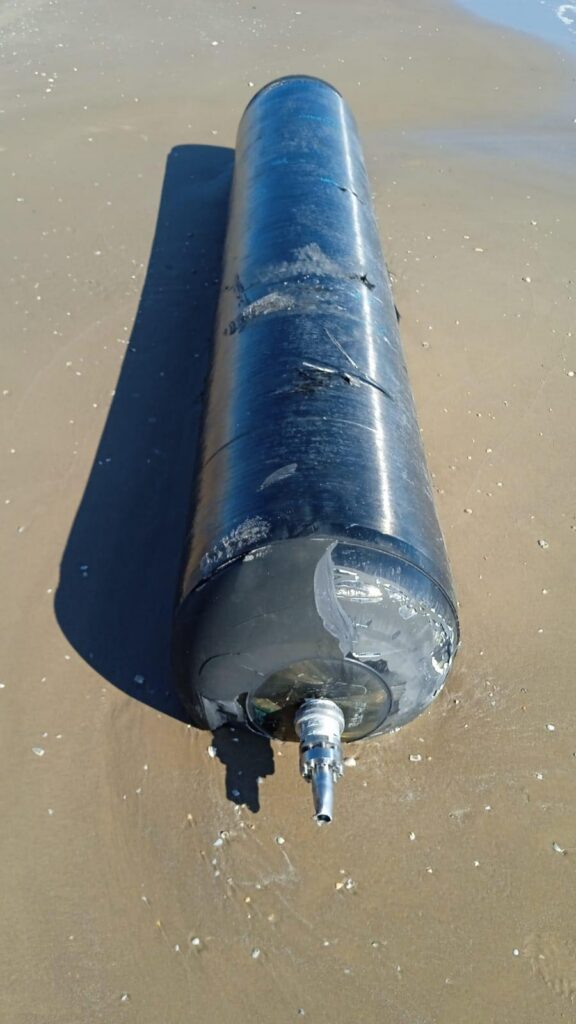 A través de sus redes sociales, CONIBIO Global confirmó este 15 de octubre que se encontró un tanque de 200 litros, parte del sistema de propulsión, a la orilla de Playa Bagdad.
