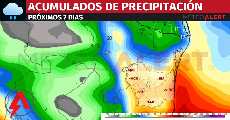 TAMAULIPAS.- La actividad de lluvias volverá con fuerza al centro de Tamaulipas a partir de mañana martes 7 de octubre, de acuerdo con el pronóstico de Meteo Alert Victoria, que advierte un incremento importante en la precipitación acumulada para los próximos siete días, con posibilidad de eventos localmente fuertes a intensos.