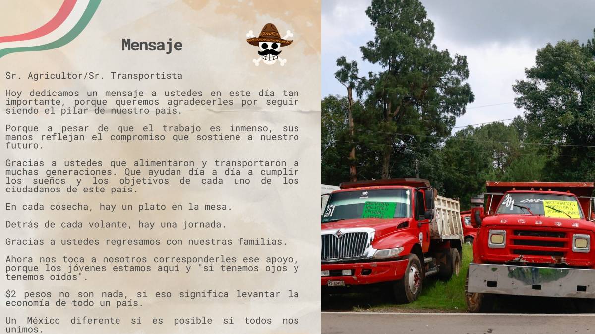 MÉXICO.- La Generación Z difundió un mensaje dirigido a agricultores y transportistas, en el que reconoce su labor como uno de los pilares fundamentales del país. En el texto, los jóvenes agradecen a quienes han alimentado y transportado a México durante generaciones, destacando que detrás de cada cosecha hay un plato en la mesa y detrás de cada volante, una jornada que permite a miles regresar con sus familias.