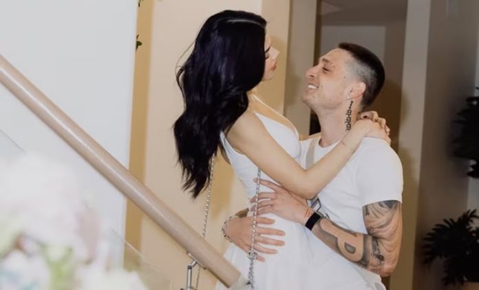 La pareja compartió una sesión de fotos muy romántica en horas recientes, en las imágenes, el cantante de corridos tumbados aparece abrazando y cargando a la cantante, quien luce un vestido blanco corto.