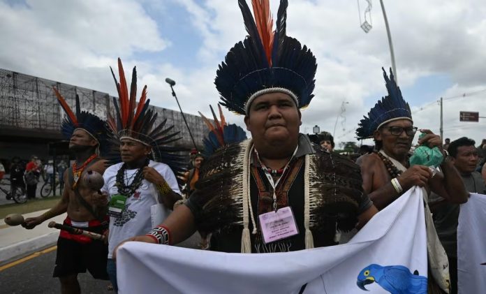BRASIL.- Unos 100 manifestantes indígenas bloquearon pacíficamente el viernes por la mañana la entrada principal de la sede de la conferencia climática de las Naciones Unidas en el borde de la Amazonía brasileña. El estancamiento terminó tras una larga discusión, cuando el presidente del evento sostuvo en brazos al bebé de uno de los manifestantes.