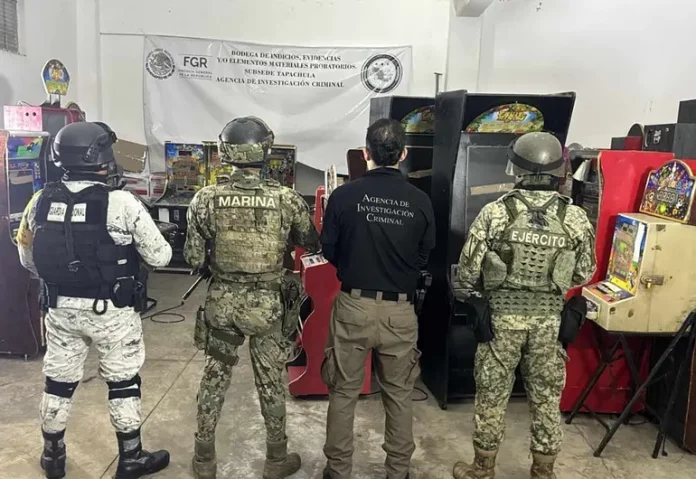 CHIAPAS.- Elementos de la Secretaría de Marina-Armada de México (Semar) en coordinación con la Defensa, Agencia de Investigación Criminal y Guardia Nacional en cuatro acciones diferentes, aseguraron 41 máquinas tragamonedas, en el municipio de Tuxtla Chico, Chiapas.