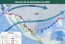 Por otra parte, un nuevo sistema frontal se aproximará al noroeste del país, interaccionará con una vaguada en niveles medios y altos de la atmósfera y con un río atmosférico, propiciando descenso de temperatura, rachas de viento de 60 a 80 km/h, chubascos y lluvias puntuales fuertes en dicha región, así como probabilidad de caída de nieve o aguanieve en sierras de Chihuahua (sur) y Durango.