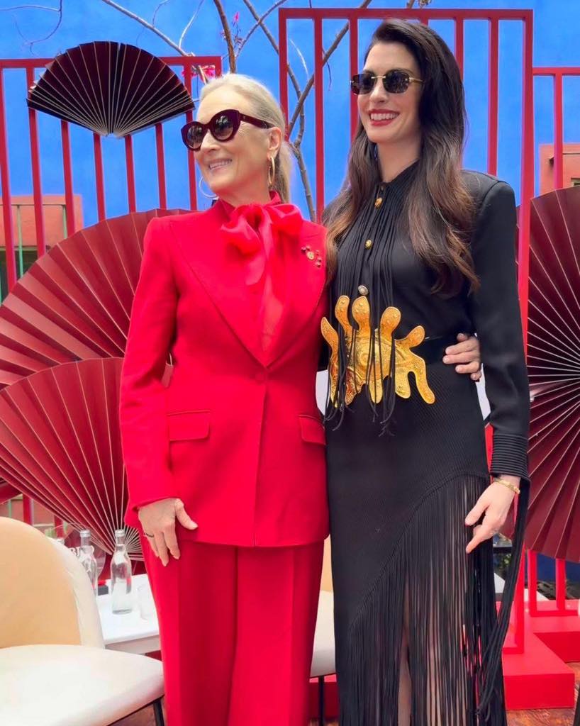 Más allá del momento cinematográfico, el verdadero guiño estuvo en la moda: ambas actrices demostraron que el universo de la revista Runway sigue más vigente que nunca, incluso fuera de la pantalla.