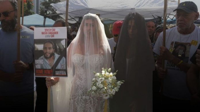 Ilana camino vestida de blanco, un símbolo de pureza y esperanza, acompañada por su suegra, Einav Zangauker, una figura cuya incansable labor en las protestas por la liberación de rehenes la ha convertido en un estandarte de la causa, cuando llegó al altar quien la esperaba era la fotografía de búsqueda de su prometido Matan.