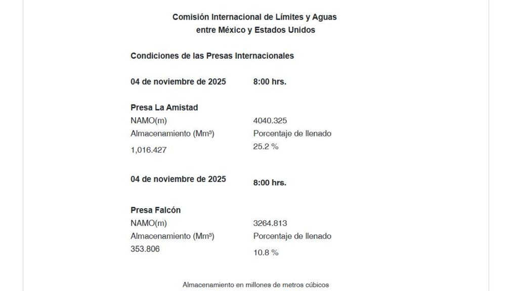 El panorama hídrico no es alentador. De acuerdo con la Comisión Nacional del Agua (Conagua), al 4 de noviembre de 2025 las presas internacionales que regulan las entregas a Estados Unidos operan en niveles muy bajos: