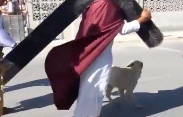 Un perro callejero defendió a un actor que interpretaba a Jesucristo en el tradicional Viacrucis, luego de ser azotado por “romanos”, en la procesión.
