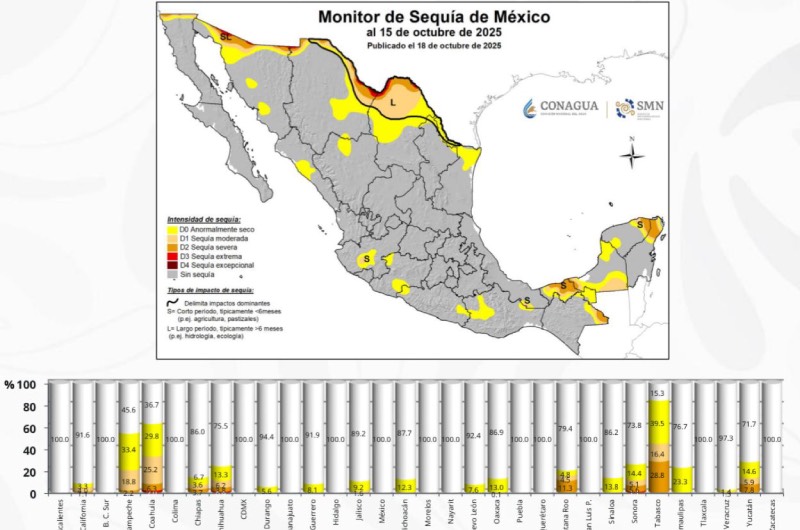 De acuerdo con el último informe del Monitor de Sequía en México, el 23.3 % del territorio tamaulipeco se encuentra en condición de “anormalmente seco”, es decir, en el nivel D0 del monitoreo oficial, lo cual marca una señal de alerta para el abastecimiento humano, agrícola y ganadero.