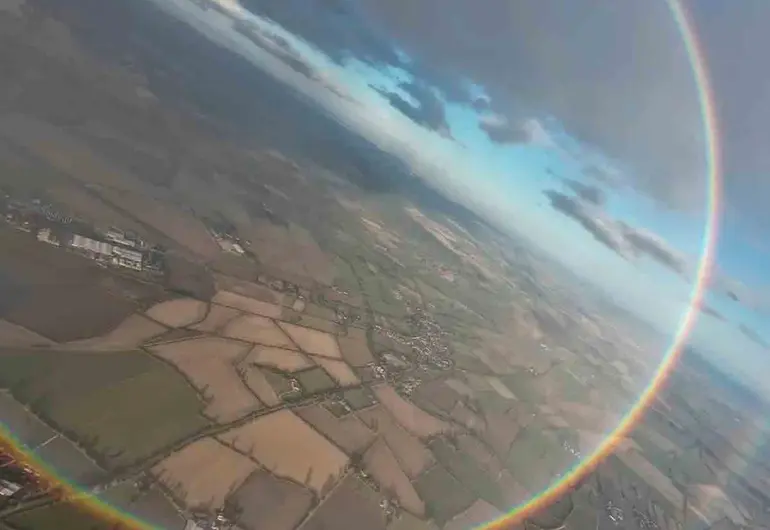 El avistamiento ocurrió el pasado 13 de septiembre, mientras el equipo de Skydive Langar saltaba sobre los campos de Nottinghamshire, y así, entre risas, gritos de emoción y maniobras en el aire, los paracaidistas se encontraron con un fenómeno natural que pocas veces se logra ver, un círculo perfecto de colores flotando entre las nubes.