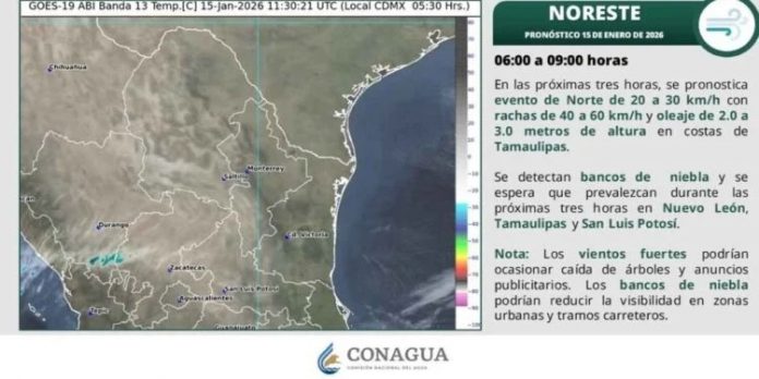 Durante la mañana, el ambiente será fresco, con condiciones de frío a muy frío en zonas altas. Por la tarde, se prevé un ambiente fresco a templado. El evento de Norte persistirá con velocidades de 40 a 50 km/h y rachas de 60 a 80 km/h en las costas de Veracruz, así como de 20 a 30 km/h con rachas de 40 a 60 km/h en las costas de Tamaulipas y Tabasco. El oleaje se mantendrá de 2.0 a 3.0 metros en la región.