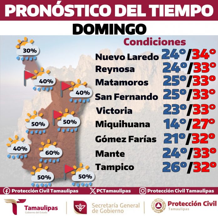 TAMAULIPAS.- Para este domingo 14 de septiembre se mantiene la actividad de tormentas y chubascos dispersos en gran parte de Tamaulipas, con lluvias fuertes acompañadas de descargas eléctricas principalmente en la zona centro, cañera y sur de la entidad.