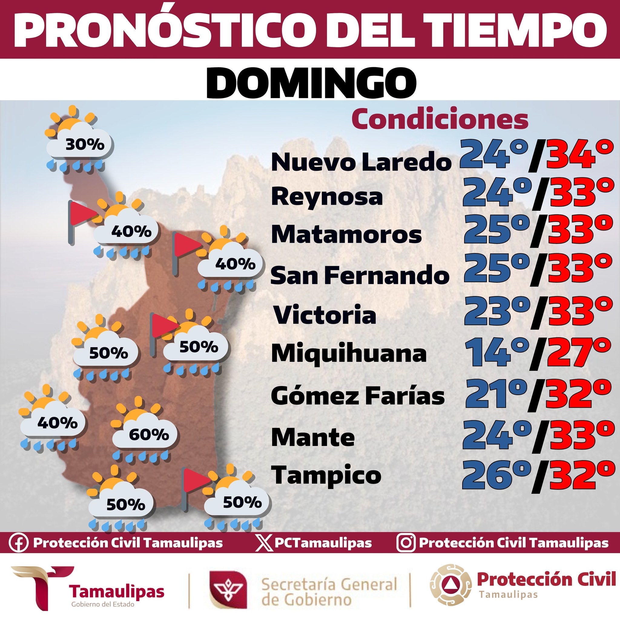 Para la zona conurbada de Tampico, Ciudad Madero y Altamira, se prevé cielo cubierto durante la mañana con temperatura promedio de 27 °C, incrementándose la probabilidad de lluvias a partir del mediodía, con un 50% de riesgo que se mantendrá hasta las 16:00 horas.