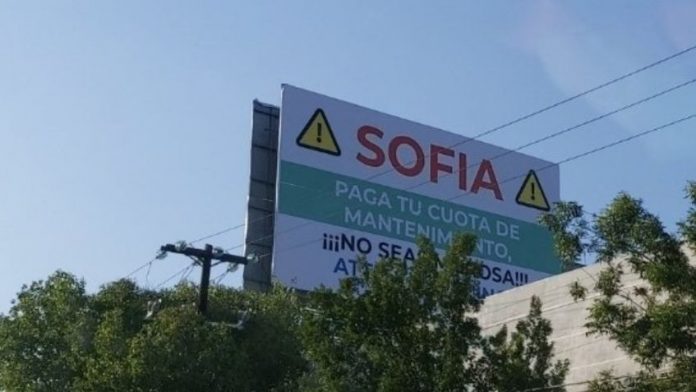 “Sofía paga tu cuota de mantenimiento. ¡No seas morosa! atentamente, tus vecinos”, menciona el espectacular que ha generado amplia polémica en las plataformas digitales.