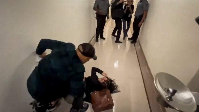 Cuando la mujer reclamó, el oficial respondió con un irónico “Adiós, adiós”. Segundos después, ella lo tocó en el pecho y él reaccionó empujándola con fuerza, derribándola al suelo. En el video se escucha al agente gritar “¡Vete!” en español mientras pedía ayuda para retirarla del edificio.